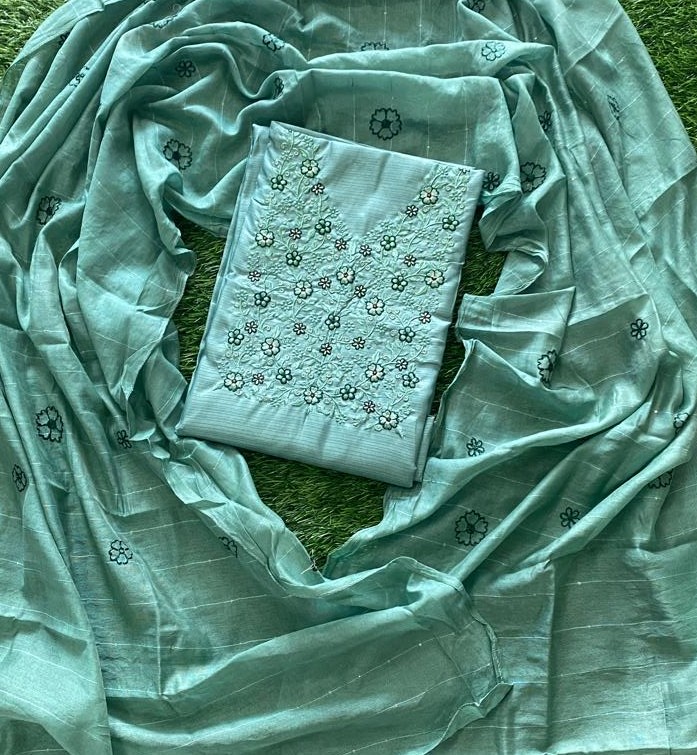 Office Wear Semi Silk Churidar Material Set.Colour : Green Shade. Top Length -2.50 meter Bottom Length-2.25 meter Shawl Length…₹595Semi Silk Churidar Material Set with Embroidery DC817-02