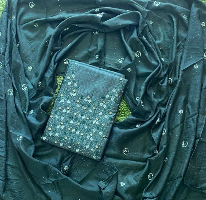 Semi Silk Churidar Material Set with Embroidery.Colour :Dark Bottle Green Top Length -2.50 meter Bottom Length-2.25 meter Shawl Length…₹925Semi Silk Churidar Materials Set DC799