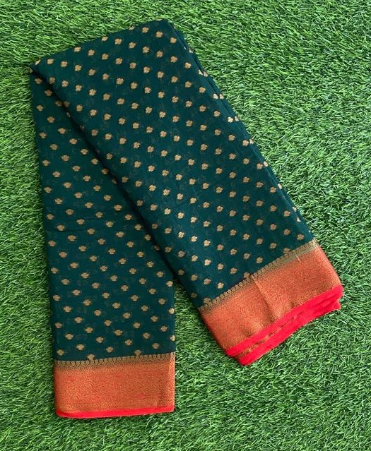 Elegant Party Wear Banarasi Silk Saree.Colour : Vibrant Bottle Green body & Border Black jerry weaving.₹1,915Elegant Party Wear Banarasi Silk Saree DS877-08